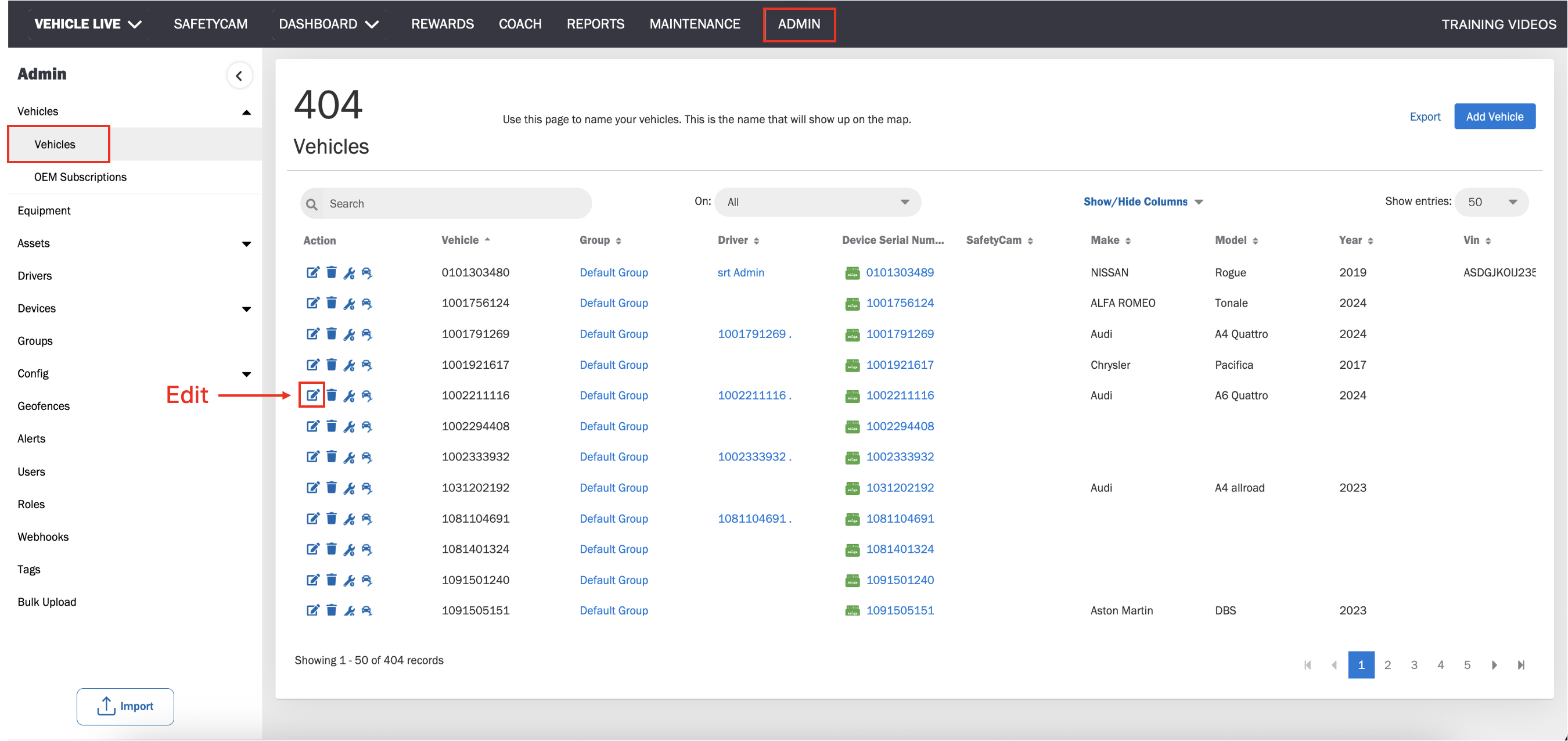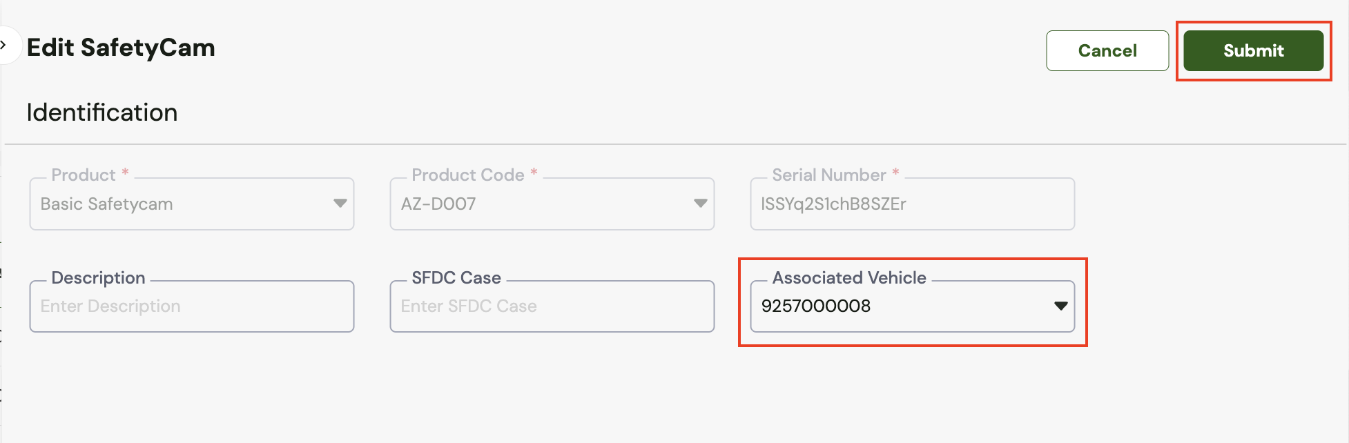 Note: Ensure that you record the Vehicle ID or Device Serial Number, along with the SafetyCam Serial Number installed in the vehicle. |
