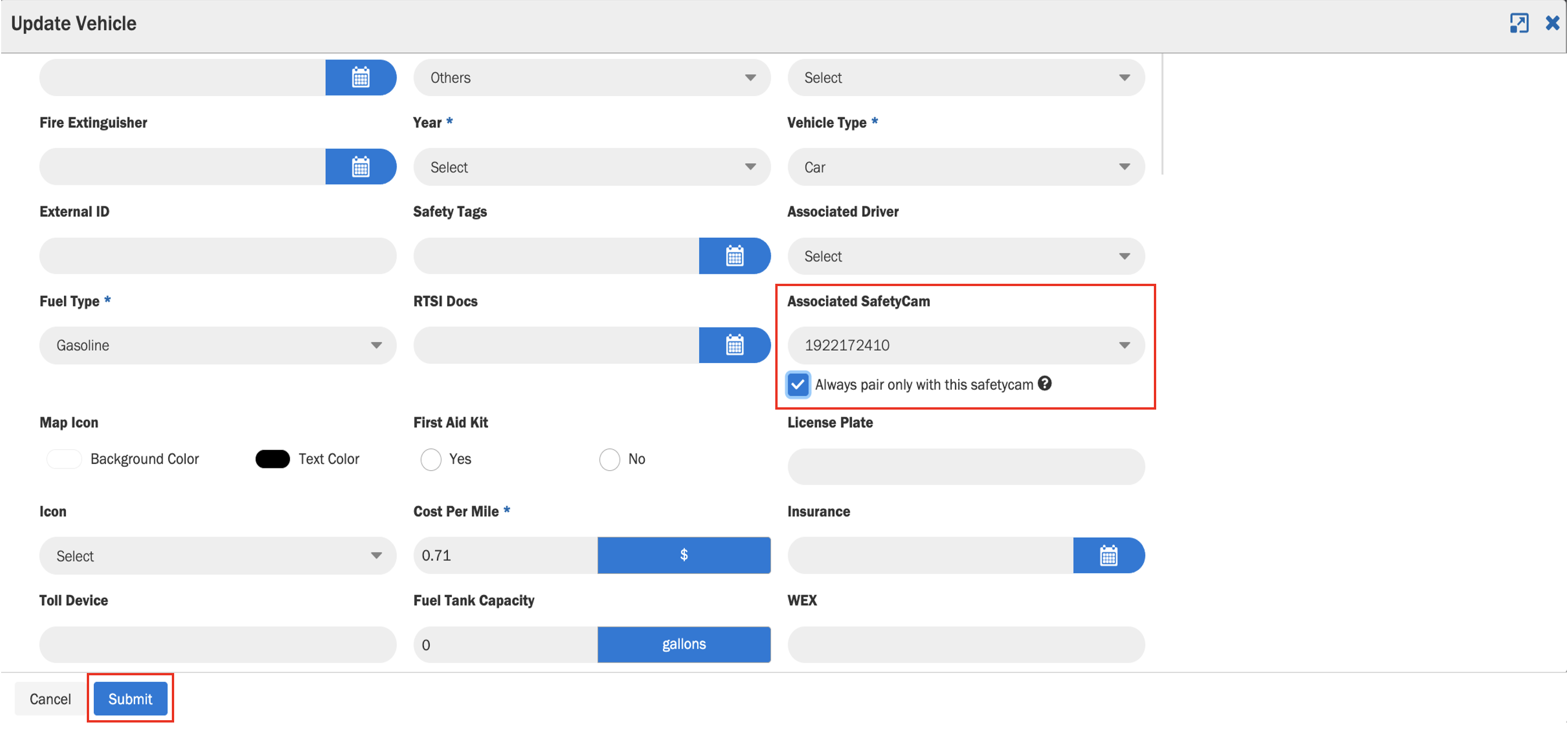Locate the Associated SafetyCam field and select the SafetyCam Serial Number from the drop-down list.
