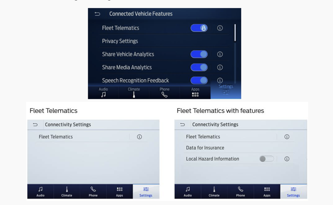 Note: Vehicles purchased and shipped directly from the Ford factory to commercial fleets will have Connectivity settings enabled by default. The user experience in the touch screen menus may not support making changes to the connectivity settings. In this case, they are on by default and there is nothing more you need to do to initiate tracking.