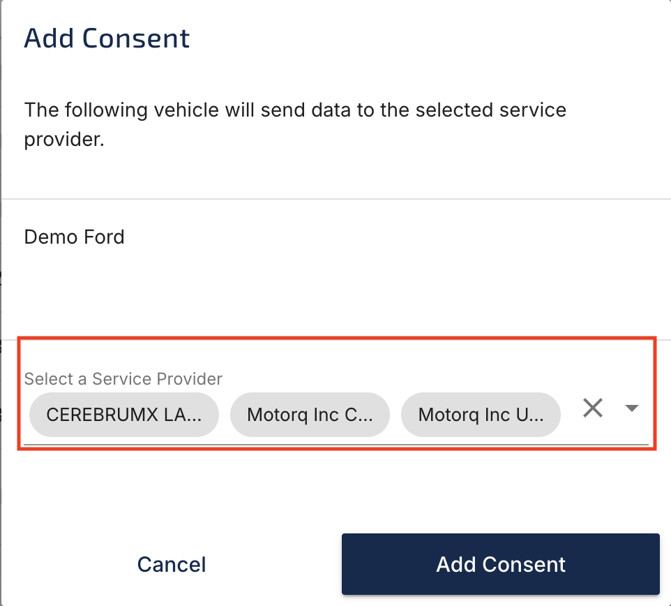 - Click “Add Consent” and choose CerebrumX and Motorq as your additional or alternate TSP.