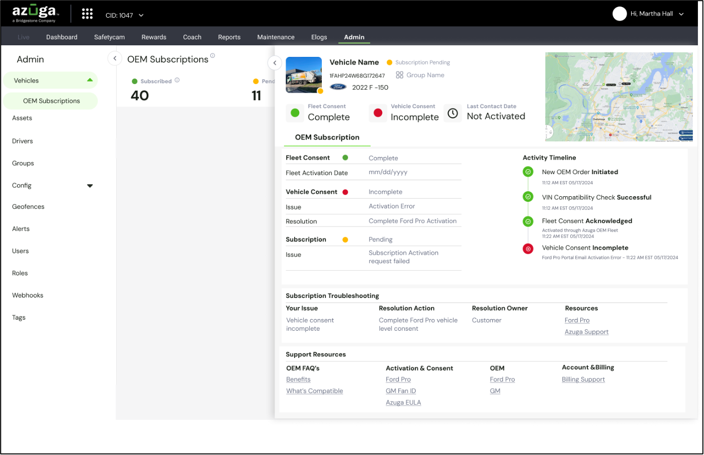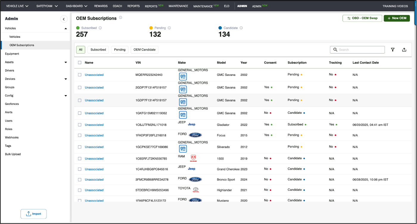 The OEM Subscriptions section under the Admin tab gives you complete visibility into the status of OEM-connected vehicles in your fleet. From this page, you can: