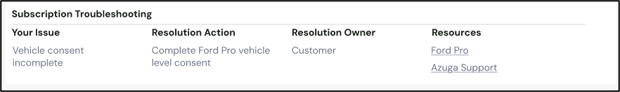 Your Issue | A brief summary of what’s preventing activation (e.g., missing vehicle consent, failed subscription, invalid VIN). |