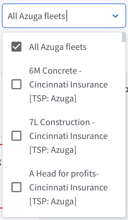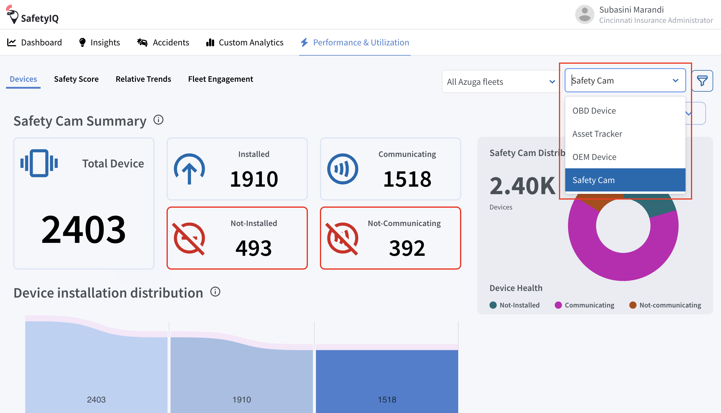 The SafetyCam Devices dashboard enables users to filter data by a specific fleet or view combined data for all fleets.
