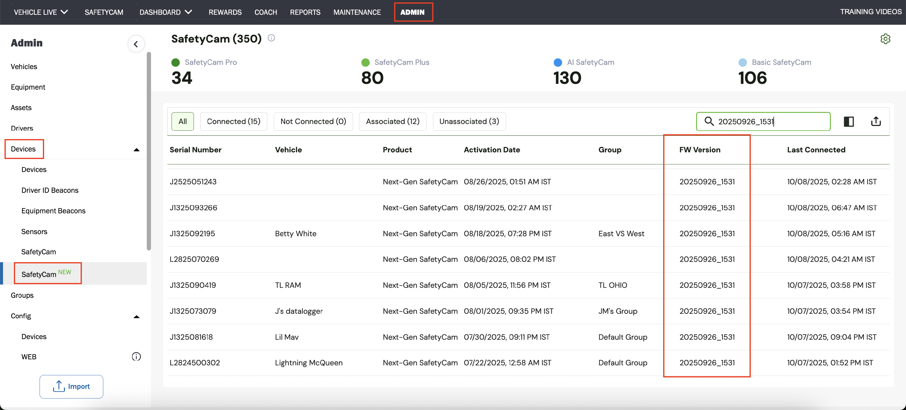 Navigate to Admin > Devices > SafetyCam New > FW Version column to verify your device version.