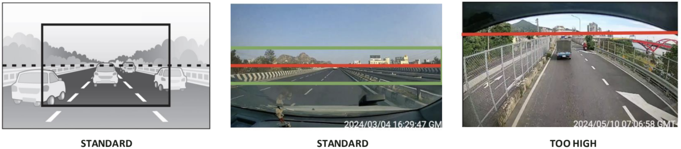 - Road-Facing Camera - Adjust the camera so the road is centered within the frame, neither too high nor too low. Use the red line in the image below as a focus guide.
