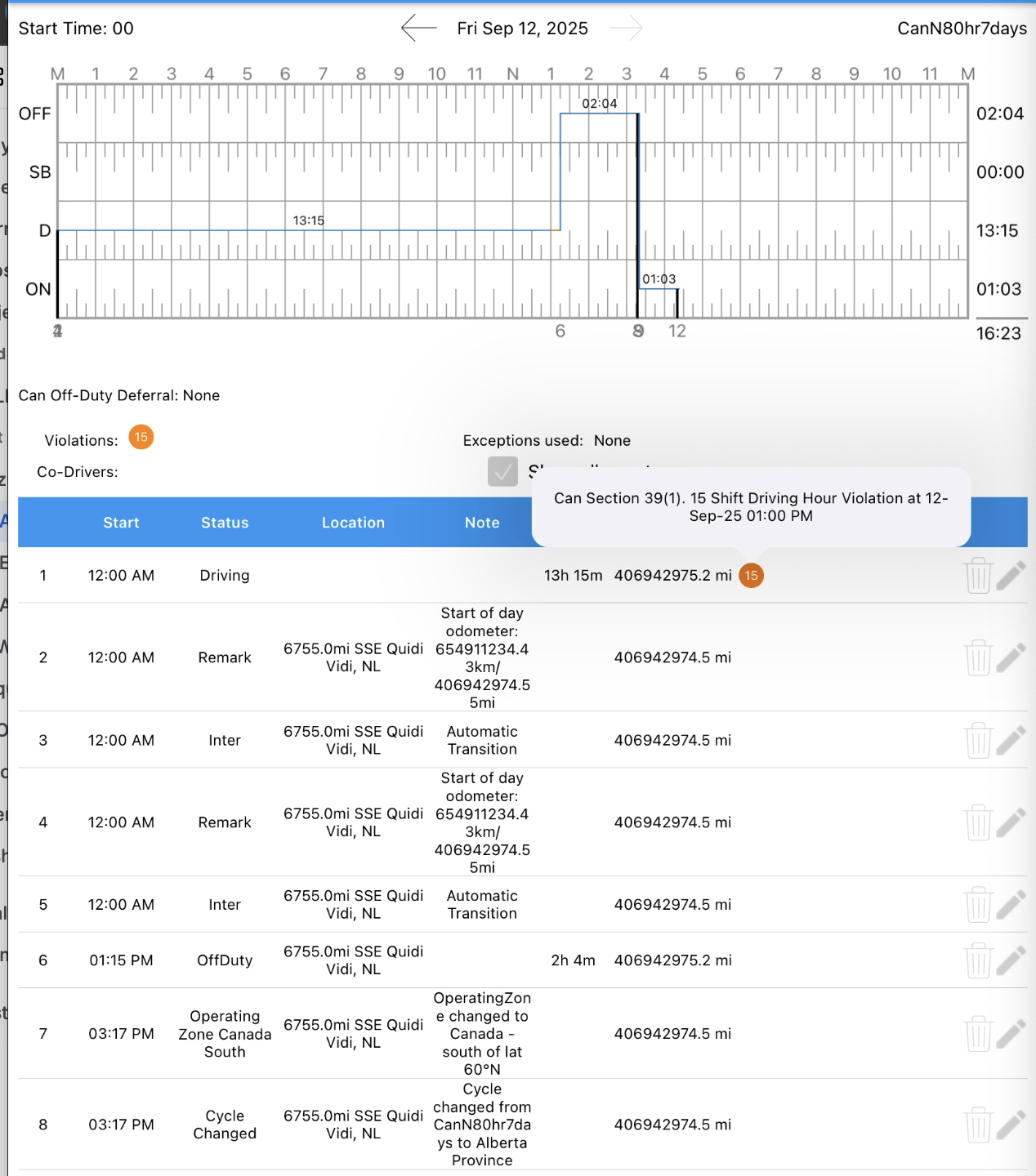 The logic has now been updated so that the daily limit does not apply to drivers in Canada North. Instead, only the shift-based rules - driving limit (15 hours per shift), on-duty limit (18 hours per shift), and shift/workday limit (20 hours with an 8-hour off-duty break) - are enforced as per regional requirements.