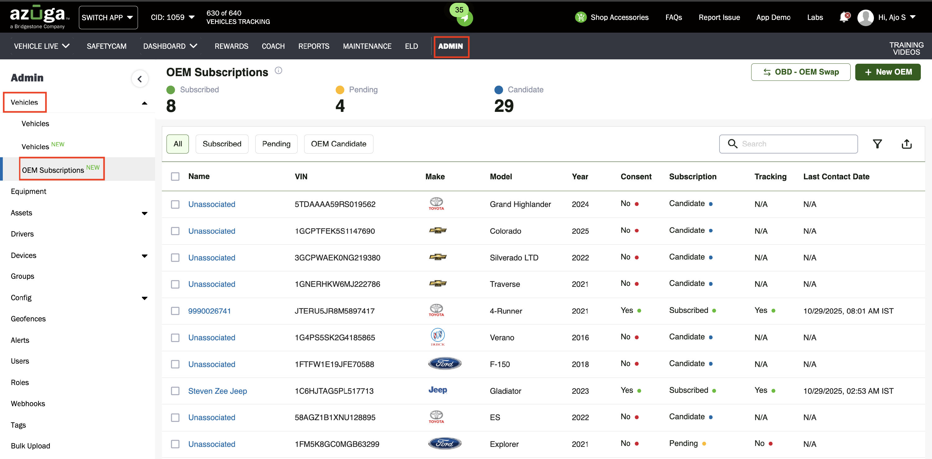 Log in to Azuga Web Fleet today and navigate to Admin → Vehicles → OEM Subscriptions (New)