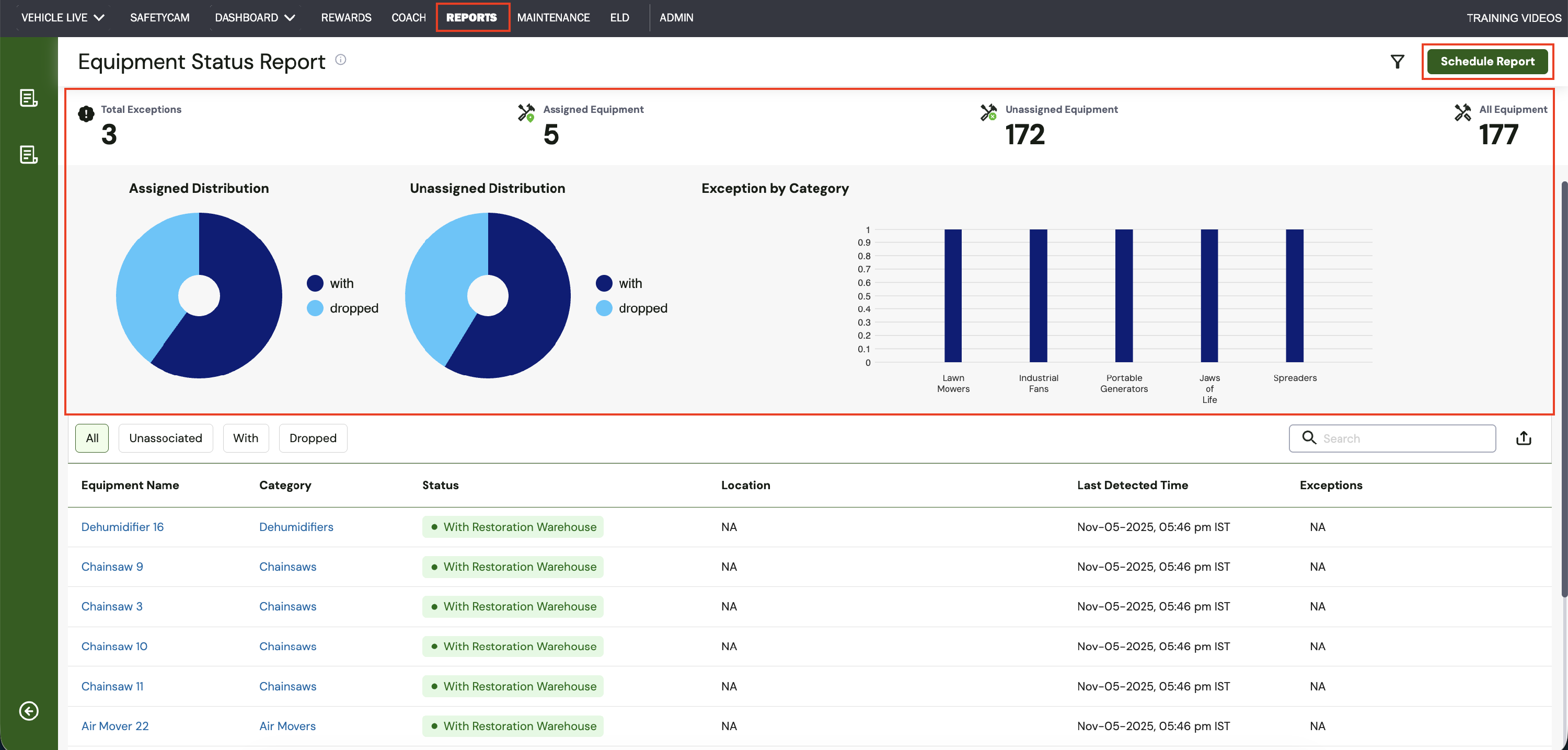 The report layout now presents key metrics and data summaries at the top, along with interactive visual charts for assigned and unassigned equipment distribution and exceptions by category, making it easier to interpret equipment status in one place.
