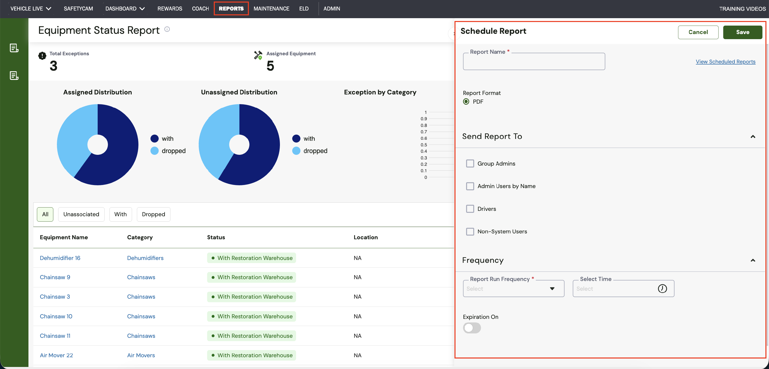 - The Equipment Status Report, found under the Reports module, has been upgraded for better visibility and ease of use. It now includes a Schedule Report option, clearer PDF exports, and an enhanced layout with visual charts for quicker insights and easier analysis.