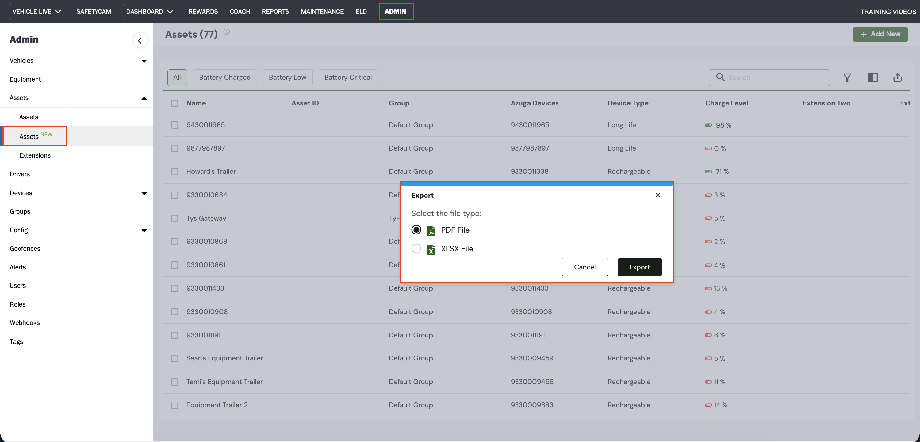 A new Export button has been added to the New Assets page under the Admin module, making it easier to download and share asset data. Asset details can now be exported in PDF or XLSX format for quick reporting and analysis.