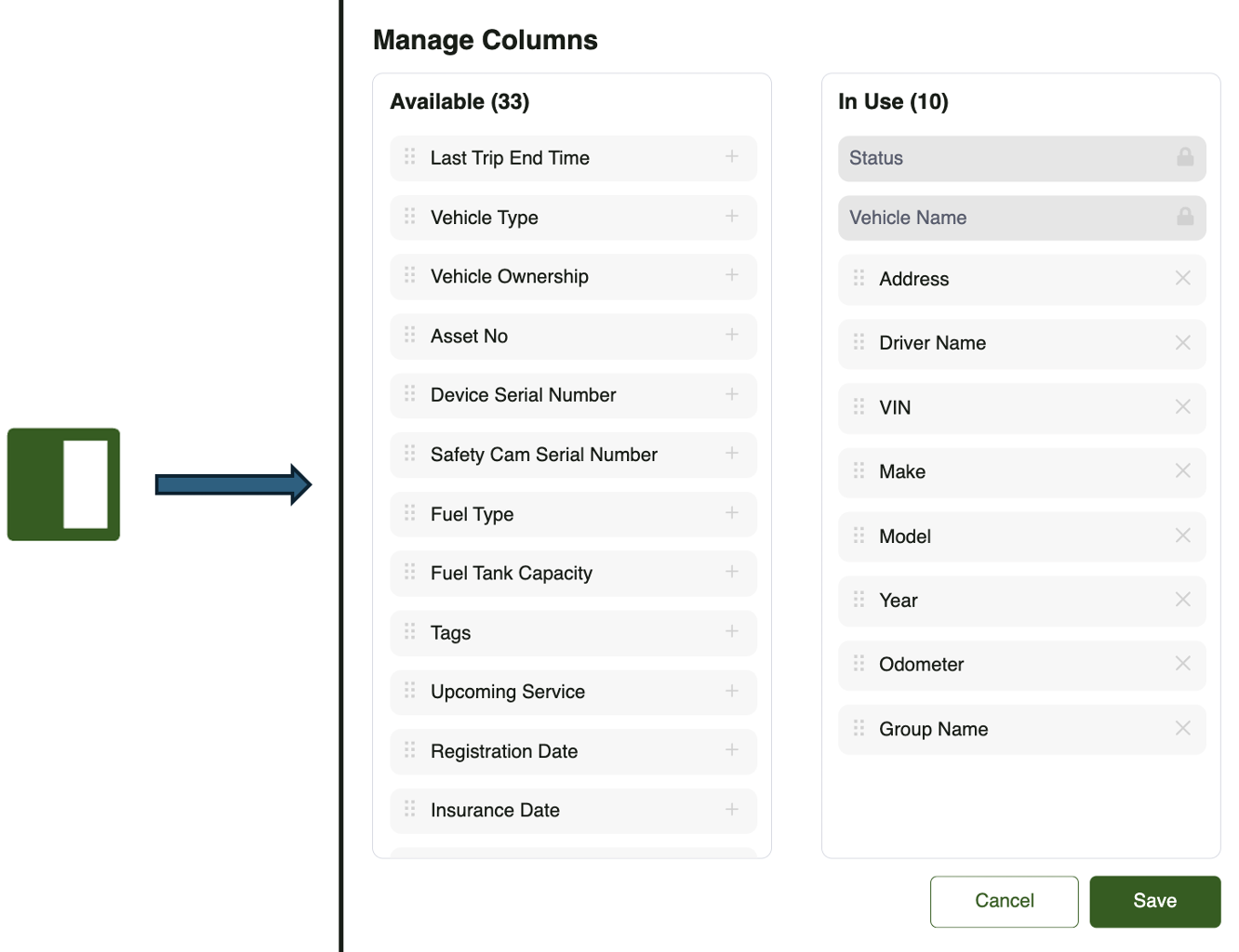 The Vehicle Table has multiple available columns that can be configured based on user needs. By default, the Status and Vehicle Name column is always enabled, while others can be configured based on user needs. Each column provides specific information about the vehicle, driver, or fleet operations.