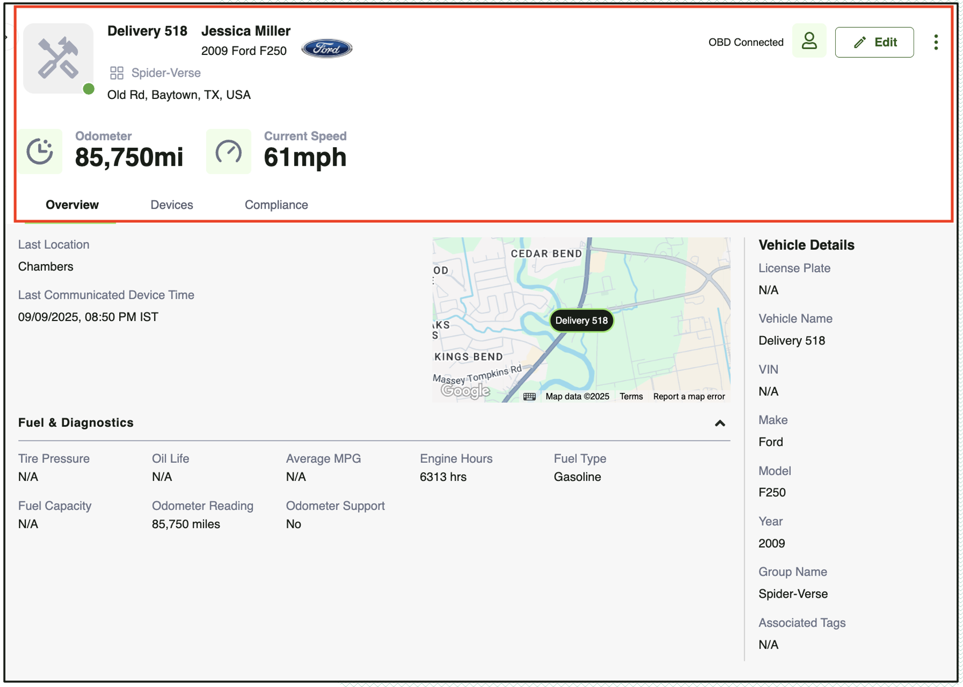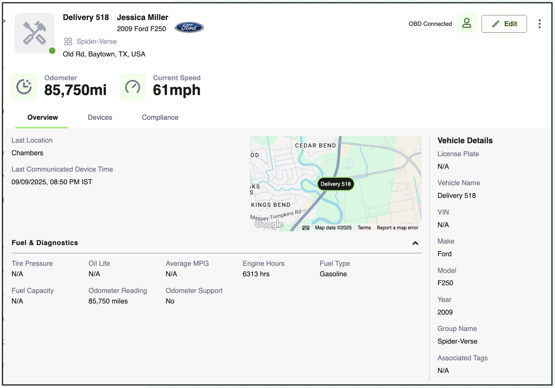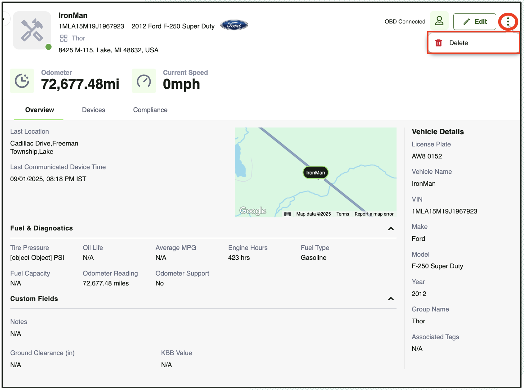 The Overview tab provides a quick snapshot of the vehicle’s most important information, including location, communication status, odometer, speed, diagnostics, and custom fields.