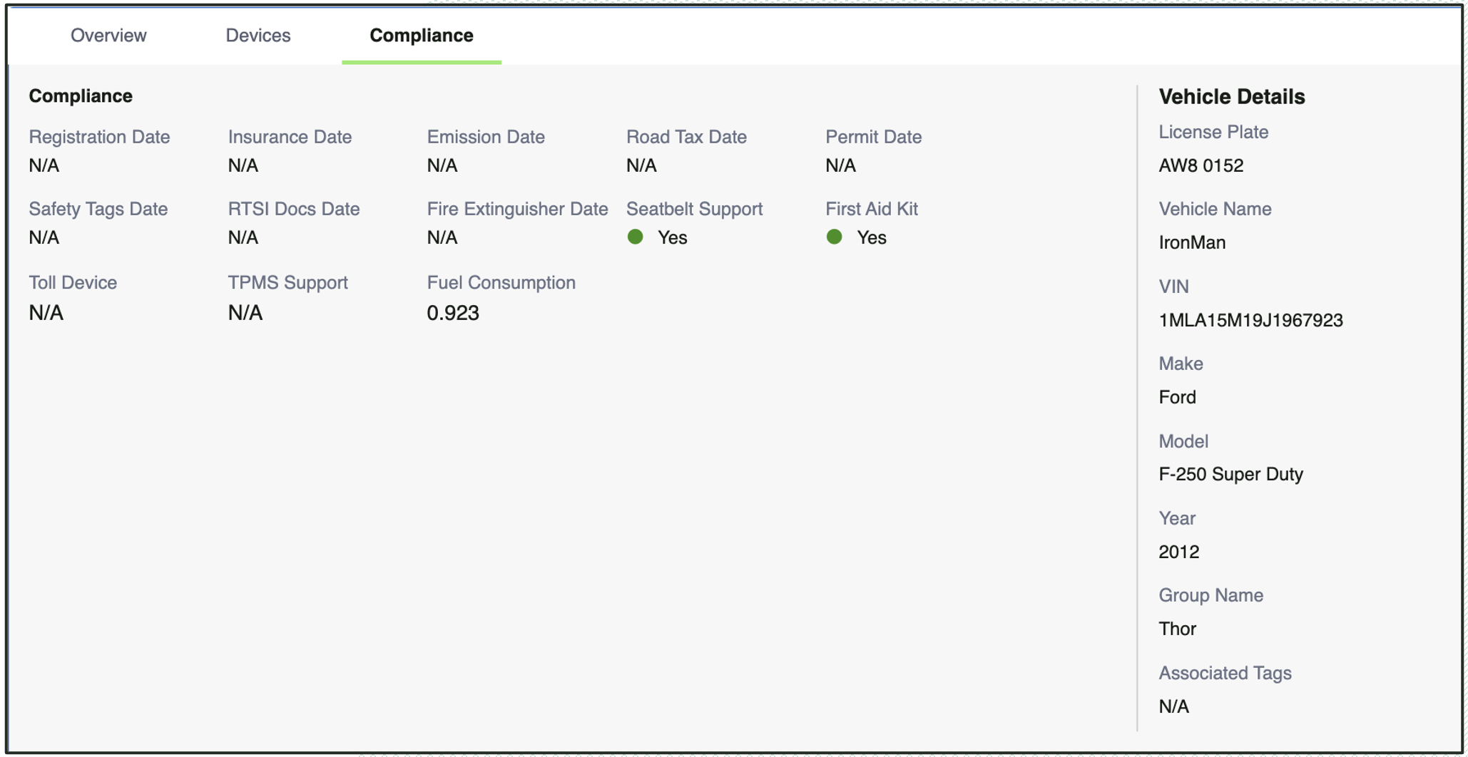 The Compliance tab consolidates all vehicle compliance-related information. It helps ensure that the vehicle meets regulatory and safety standards by tracking important documents, certifications, and equipment availability.