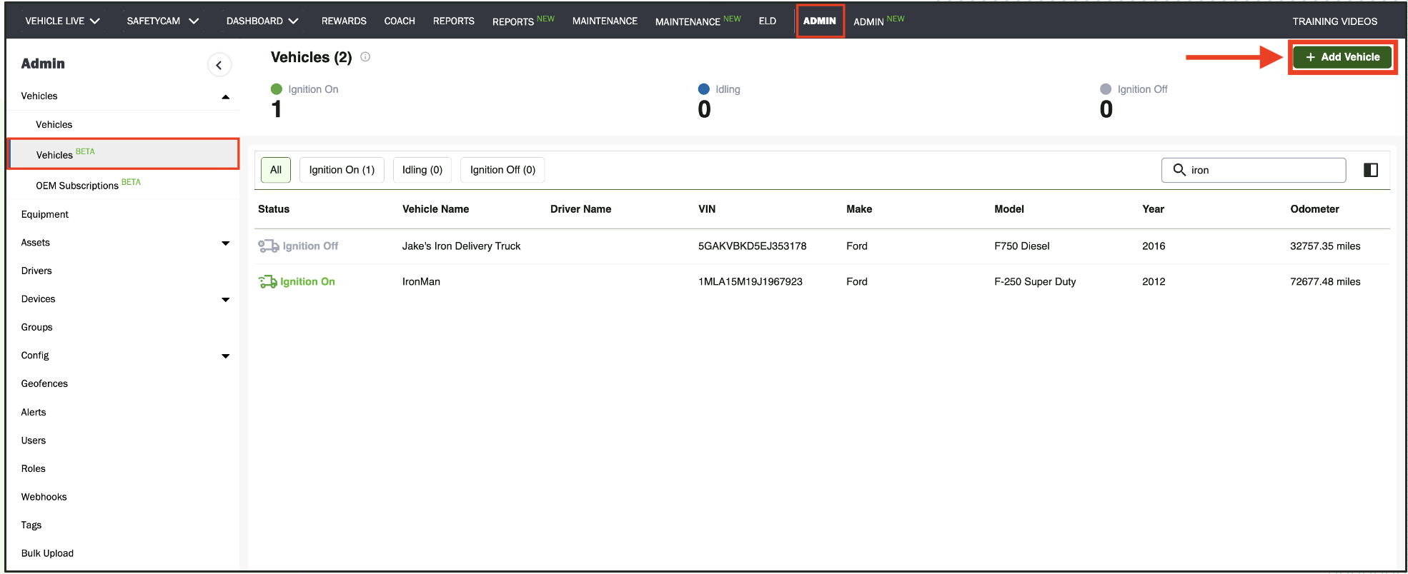 - Navigate to Admin >> Vehicles Tab >> Vehicles(New).