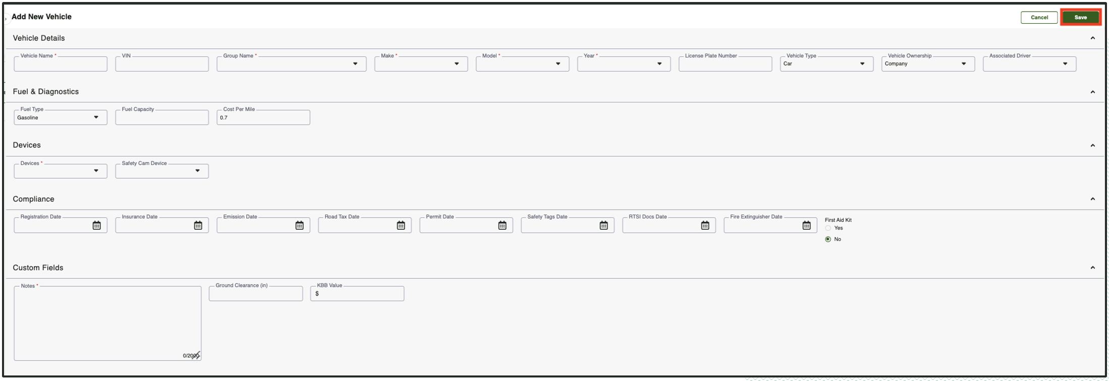 The fields available for editing are the same as those described in the Add Vehicle section. Please refer to the Add Vehicle section for a detailed explanation of each field.