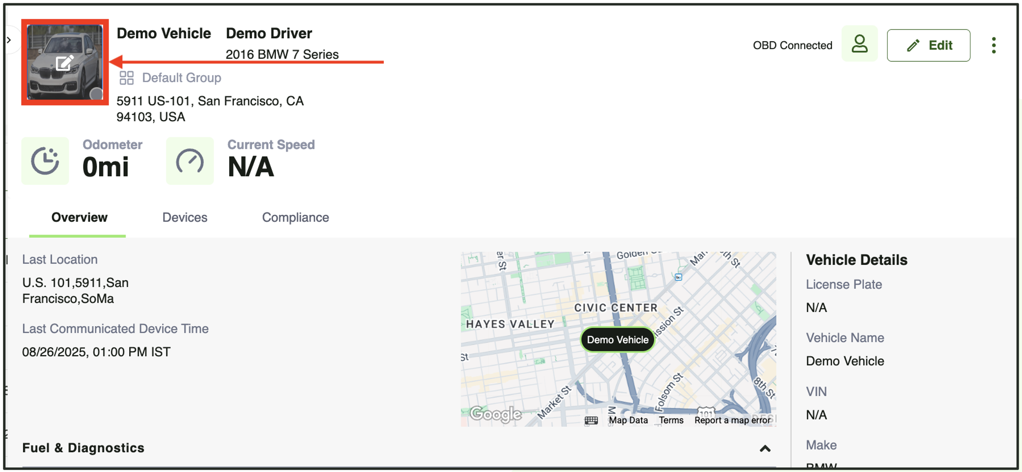 The Vehicle Image feature allows you to upload and manage images of your vehicles directly within the platform. This helps in visually identifying vehicles, improving fleet organization, and adding a personalized touch to the vehicle profile.