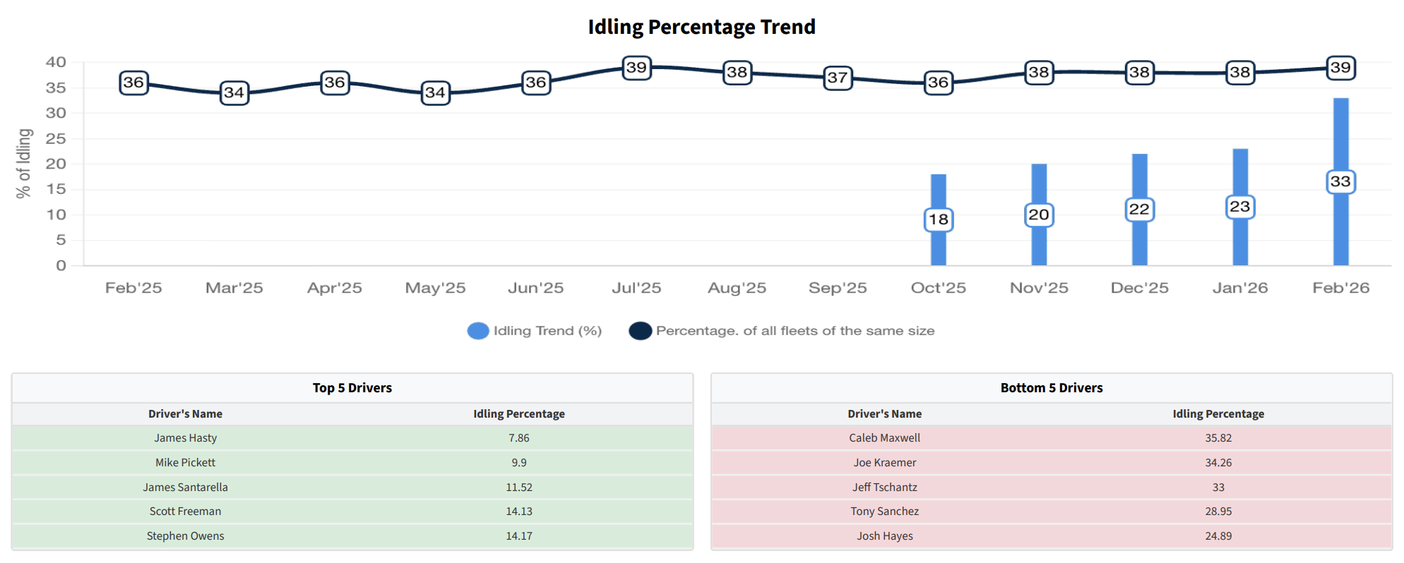 - Month-over-month idling percentages are now available, making trends easier to interpret compared to raw idling scores.