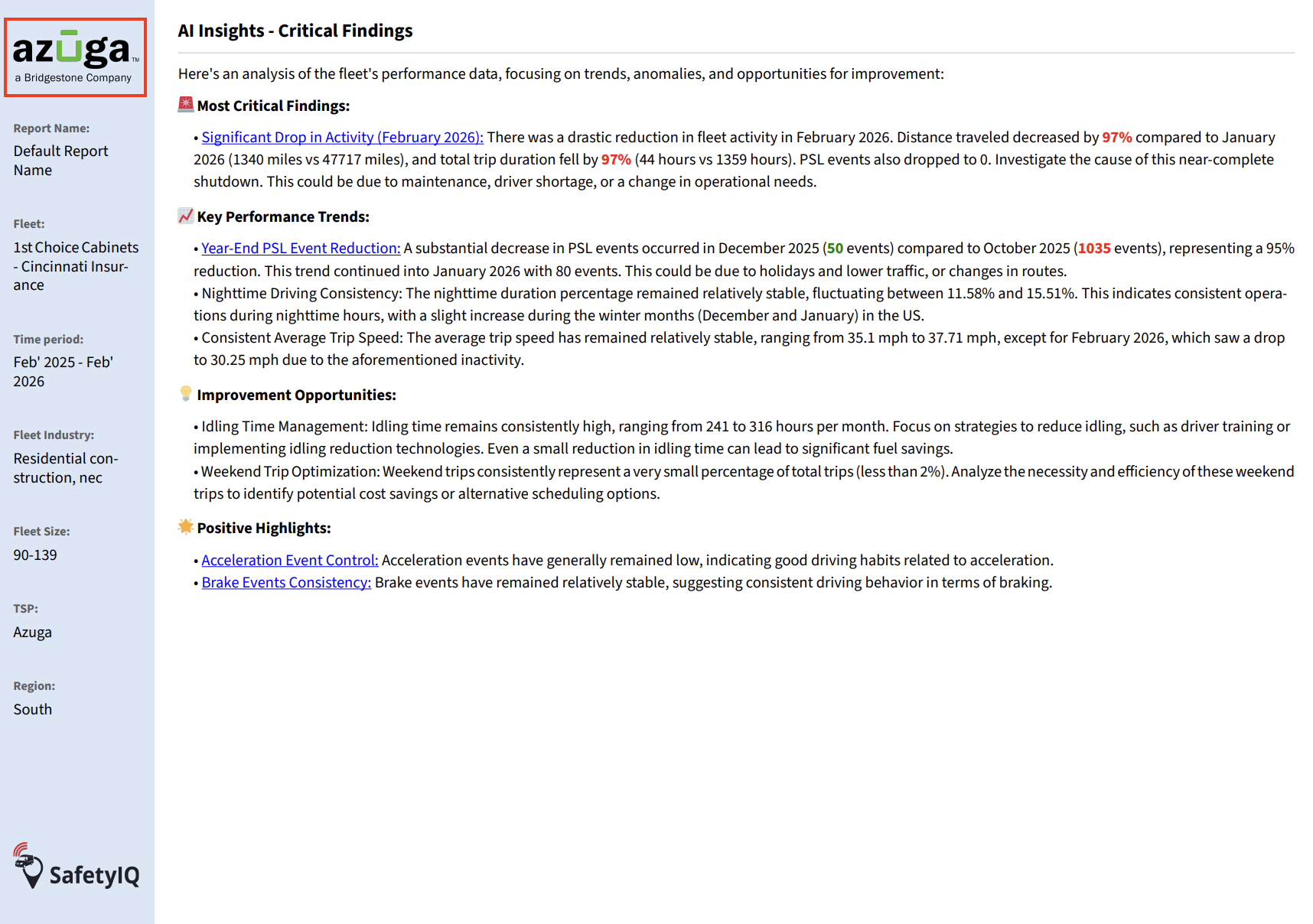 - An Azuga logo has been added alongside the SafetyIQ logo to ensure consistent branding in the published Business Report.