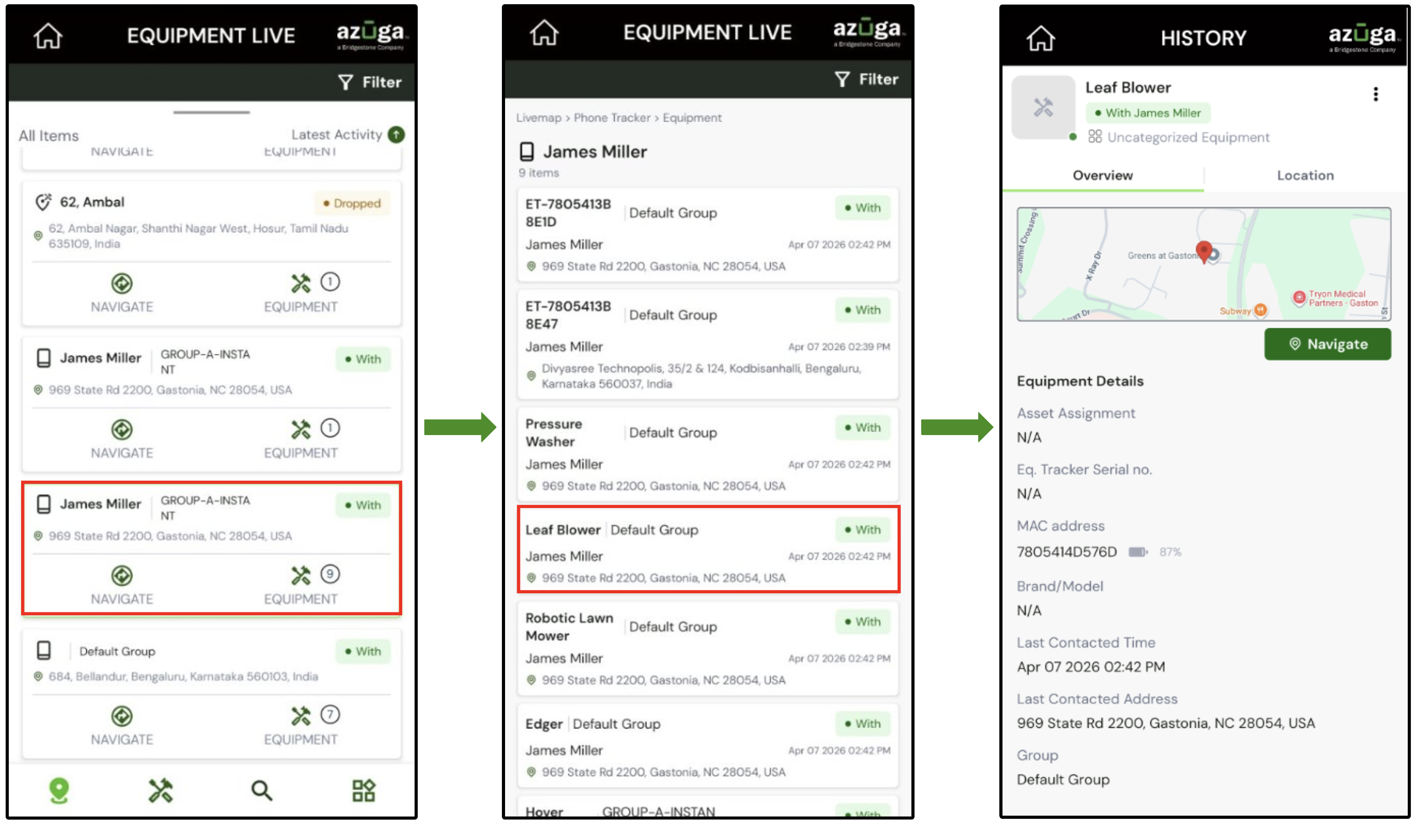 - Azuga Fleet Mobile automatically detects nearby equipment beacons on driver login to improve visibility when asset trackers are out of range. Detection runs in the background via Bluetooth, with no manual action required. Equipment continues to appear on the live map and other screens, now showing “With” (phone icon), alongside “With” (tracker icon), and “Dropped” statuses.