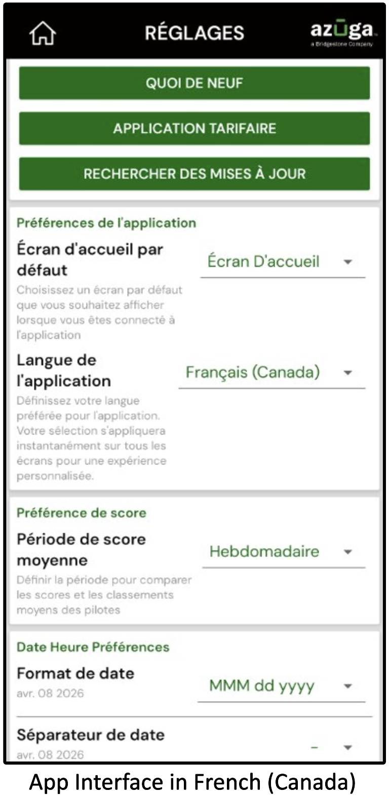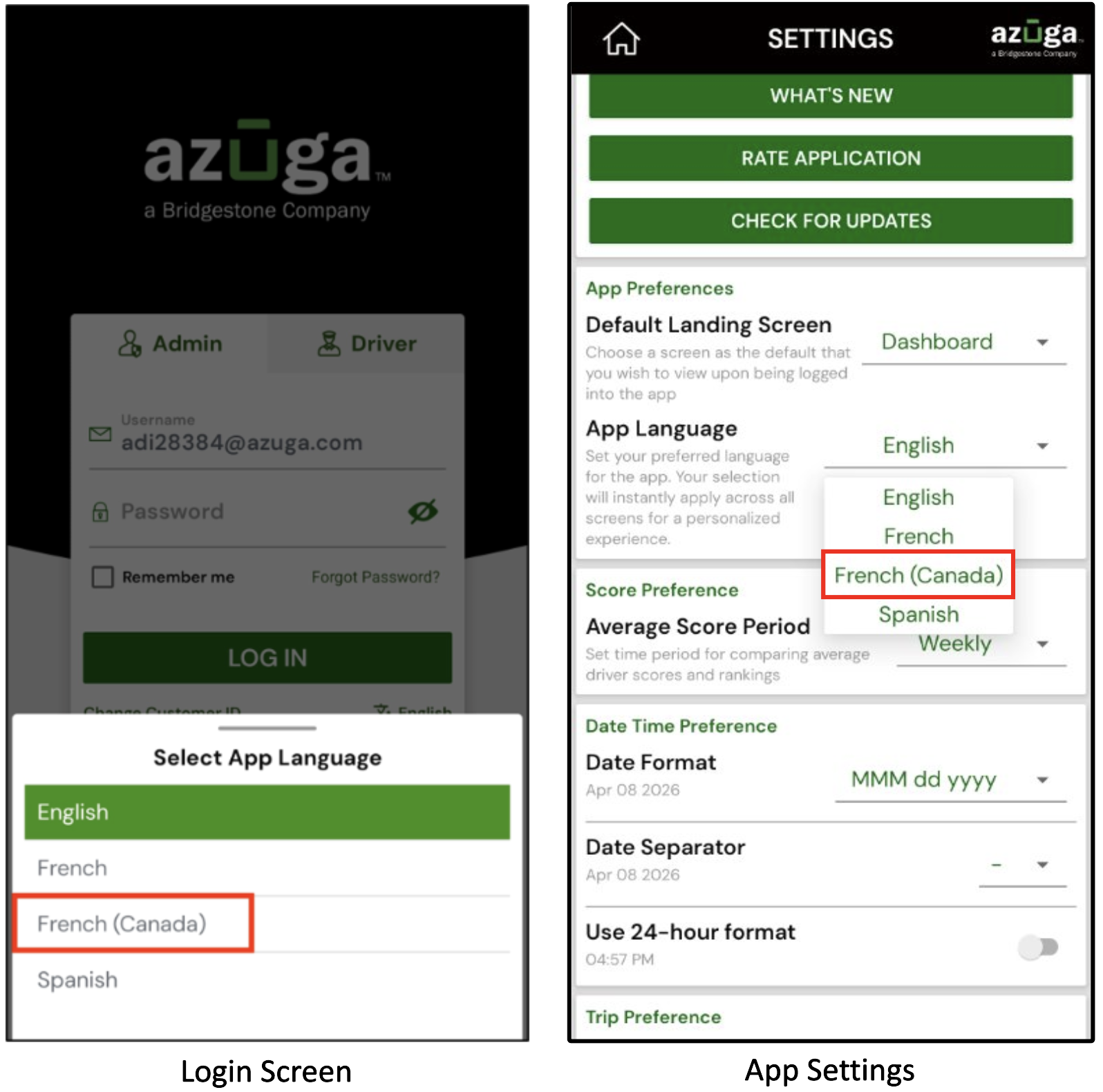 French (Canada) is now available as a language option in the Azuga Fleet Mobile app, providing a more localized and user-friendly experience for Canadian customers. Users can select this language from the login screen, app settings, and other supported interfaces. Once selected, the app interface updates across supported screens, improving usability and adoption through region-specific localization.